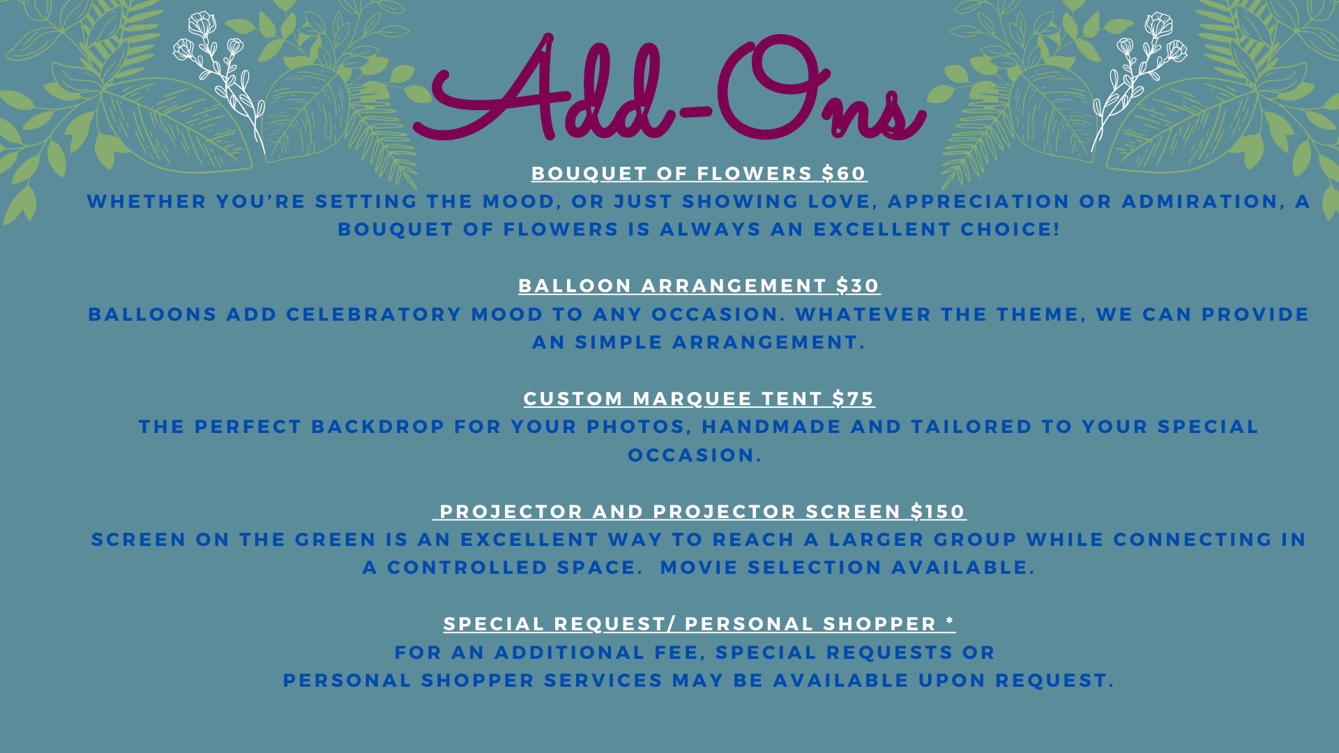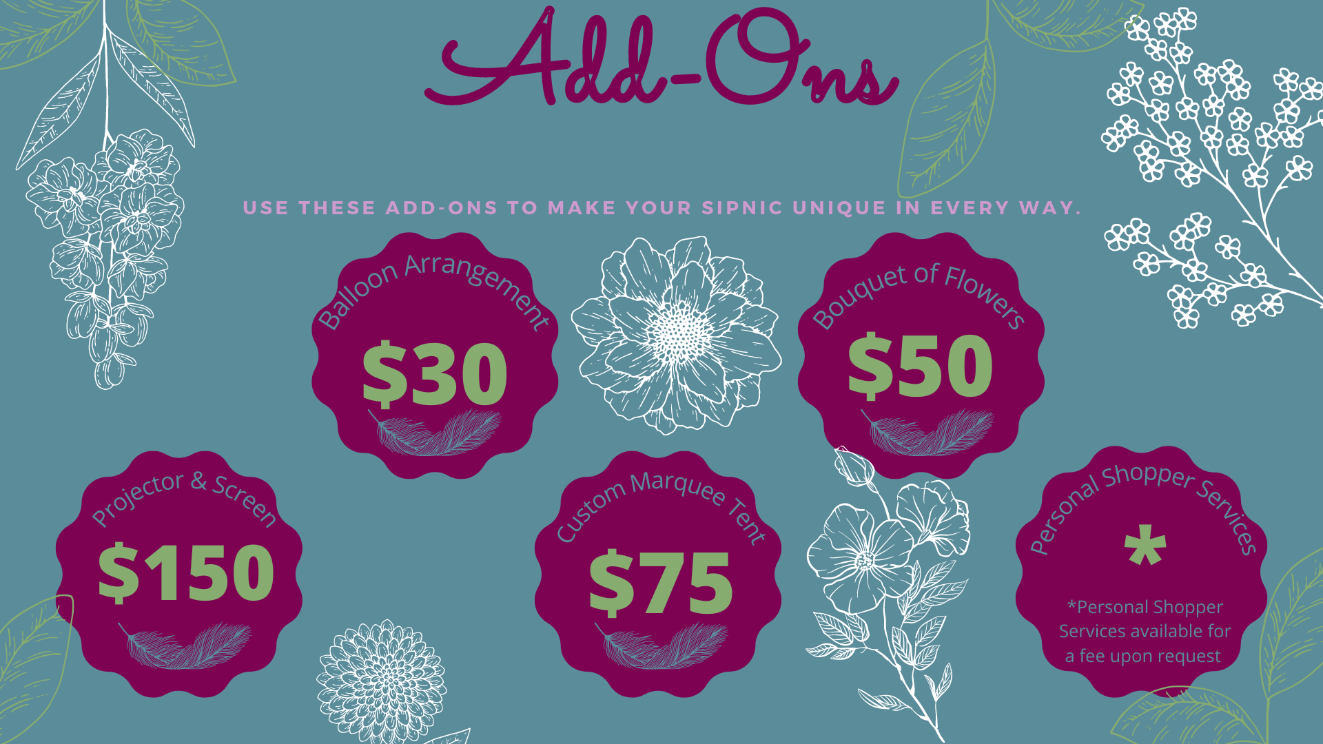 Use these add-ons to make your sipnic unique in every way.