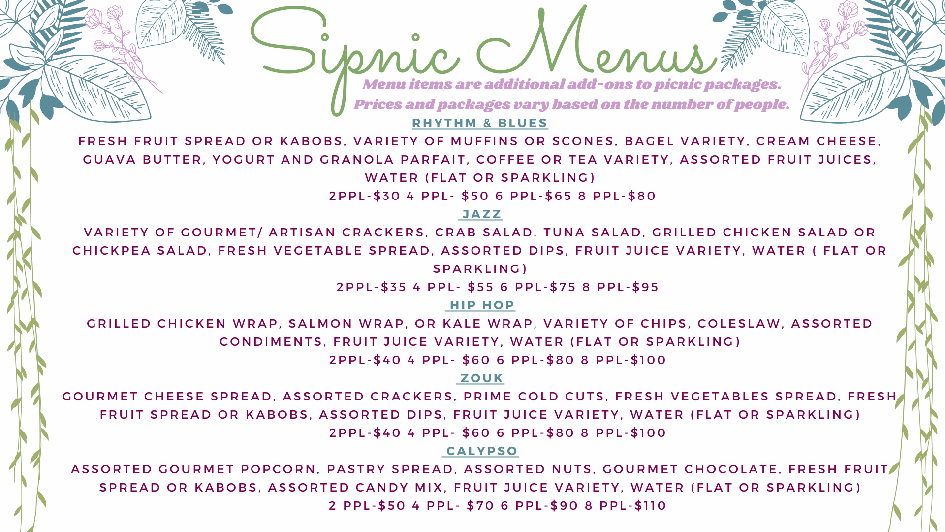Menu items are additional add-ons to picnic packages. Prices and packages vary based on the number of people.