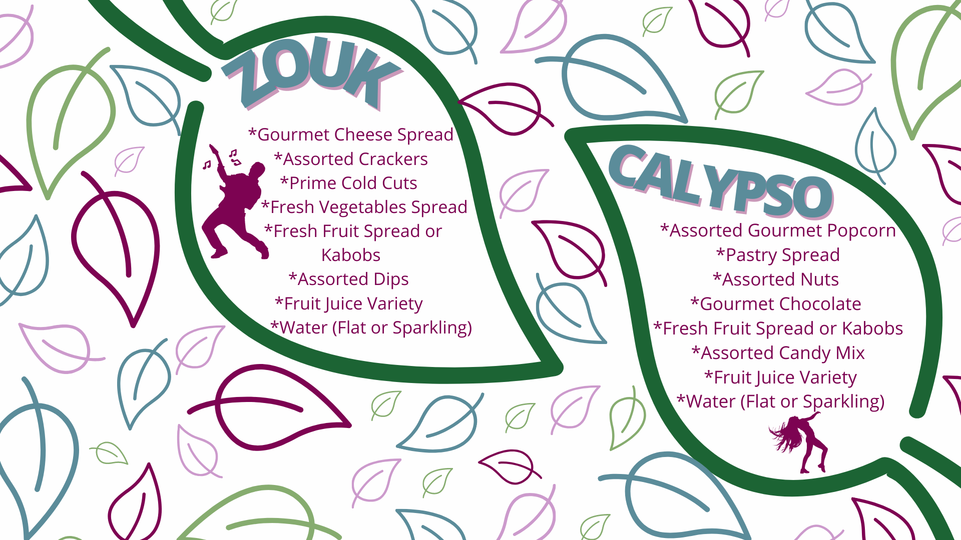 - Assorted gourmet popcorn, pastry spread, assorted nuts, gourmet chocolate, fresh fruit spread or kabobs, assorted candy mix, fruit juice variety, water (flat or sparkling)
